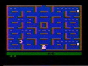 Now you might say, “Yeah the graphics were pretty bad, but most Atari 2600 games had bad graphics too.” I’ll agree with you. But I would wager to say that most of the Atari games, that were based off of arcade games, were as fun or more fun to play than there arcade counterparts. Atari could usually find some way to make the game even better. Not with Pac-Man. The ghosts on the arcade could think a little. They turned around and went the other direction after eating you ate an energizer. The ghosts on the Atari version would move aimlessly in the beginnings of the game. As the game progressed, they were fast, and all they did was go straight for you. At that point, you don’t even know that you have more than one ghost, because they all sit on top of each other while coming to attack you. They aren’t even different colors. They are all the same color as Pac-Man. Better yet, there is no ghost on the arcade version that is this color. When Pac-Man eats an energizer (now dubbed “Power Pellets” by Atari), the most annoying sound ever comes over your television speaker. There is no explanation without hearing it. The ghosts continue to look and maneuver the same as they did prior to your eating the power pellet. If you get about three inches from the TV screen you may be able to see that their color changed from a very light yellow to a very light blue. Well, you’ve always got the annoying noise to tell you whether or not you can eat a ghost. After a ghost is eaten, his square eyeballs make their way (slowly) to the ghost box. They wait until your power pellet wears off, and then materialize back into a ghost. Whereas, the arcade version has them immediately turn back into a ghost, and exit (I guess the ghost is now immune to Pac-Man’s energizer). The Atari version is so lame that you earn a “free life” every time you clear a screen. Like that is some kind of victory…clearing the screen on the Atari version. I think I did that one time with the television set turned off. You actually have to earn your free lives on the arcade version. I think it is every 10000 points.